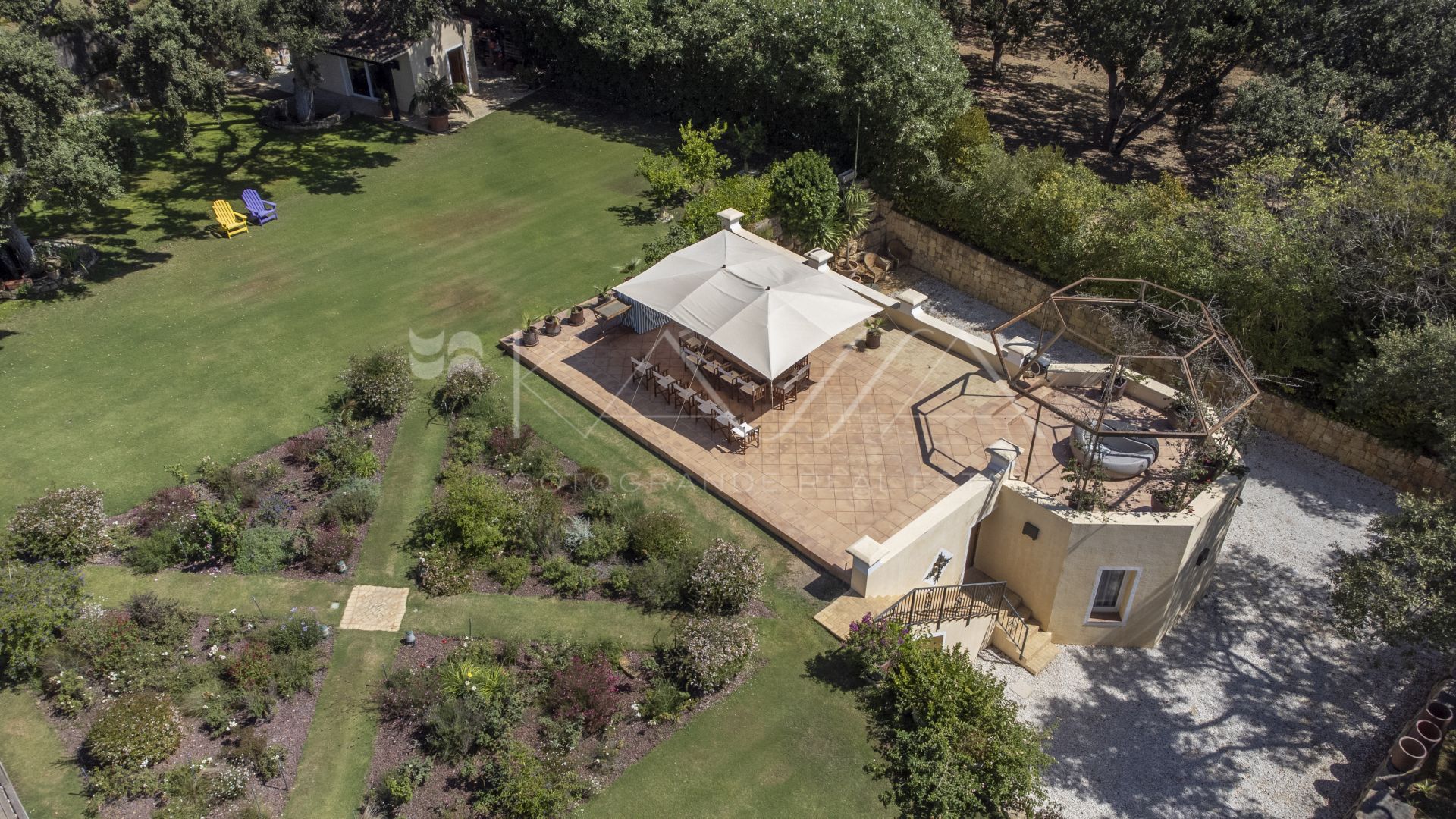 The property is divided into two independent plots: • The main one hosts the villa, spacious, bright, and designed with a refined Andalusian charm. • The second includes an auxiliary building with garage and guest apartment with en-suite bathroom, perfect for visitors or staff accommodation.